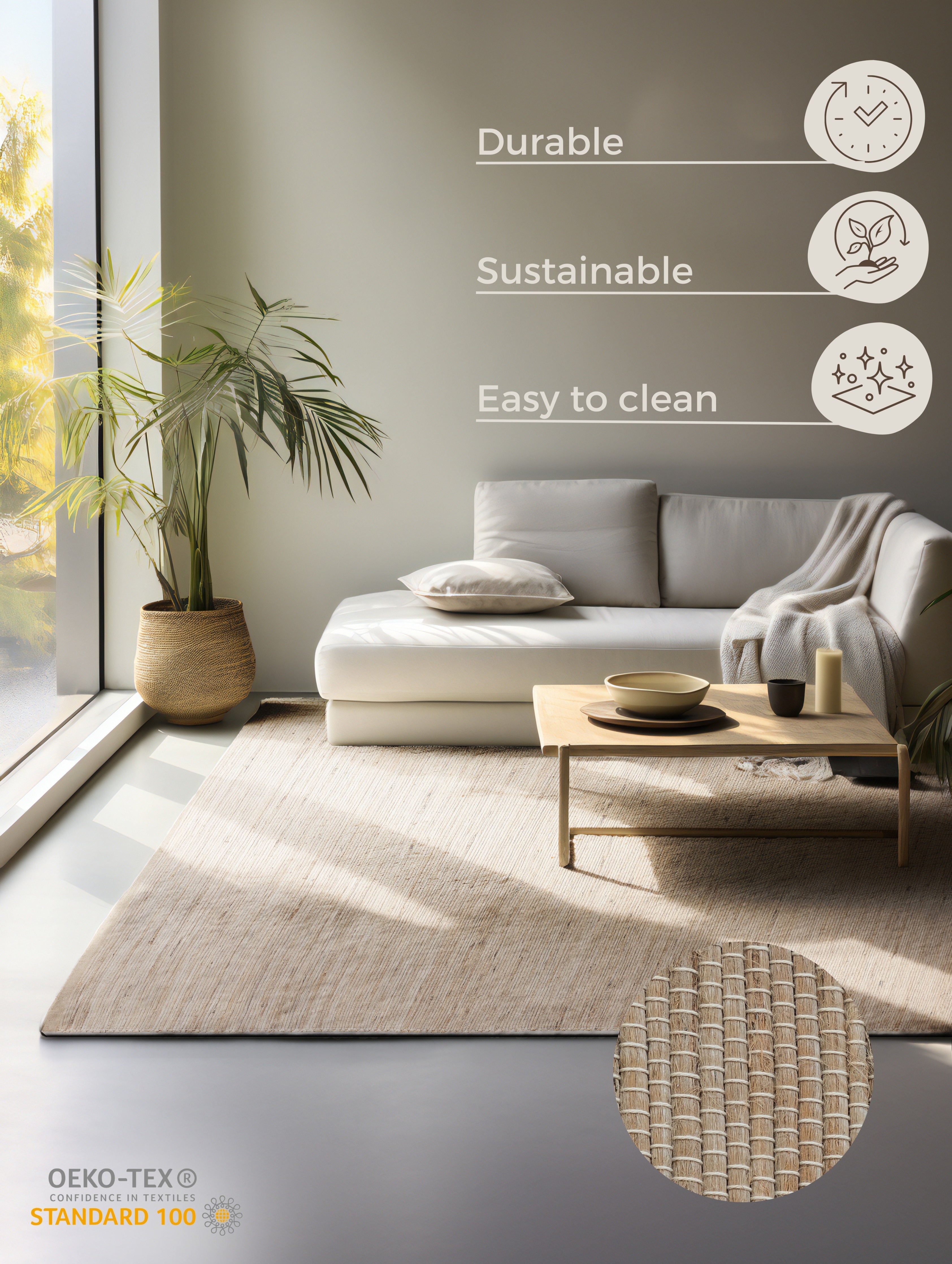 Tæppets naturlige fibre gør det både robust og smudsafvisende, hvilket gør det nemt at holde rent i hverdagen. Den slidstærke konstruktion, kombineret med den høje kvalitet af materialerne, sikrer lang holdbarhed. Både for- og bagside er fremstillet af den samme slidstærke blanding af jute, uld og bomuld, hvilket giver en ensartet og robust finish. Tæppet er desuden velegnet til gulvvarme, så du kan nyde den bløde komfort året rundt.