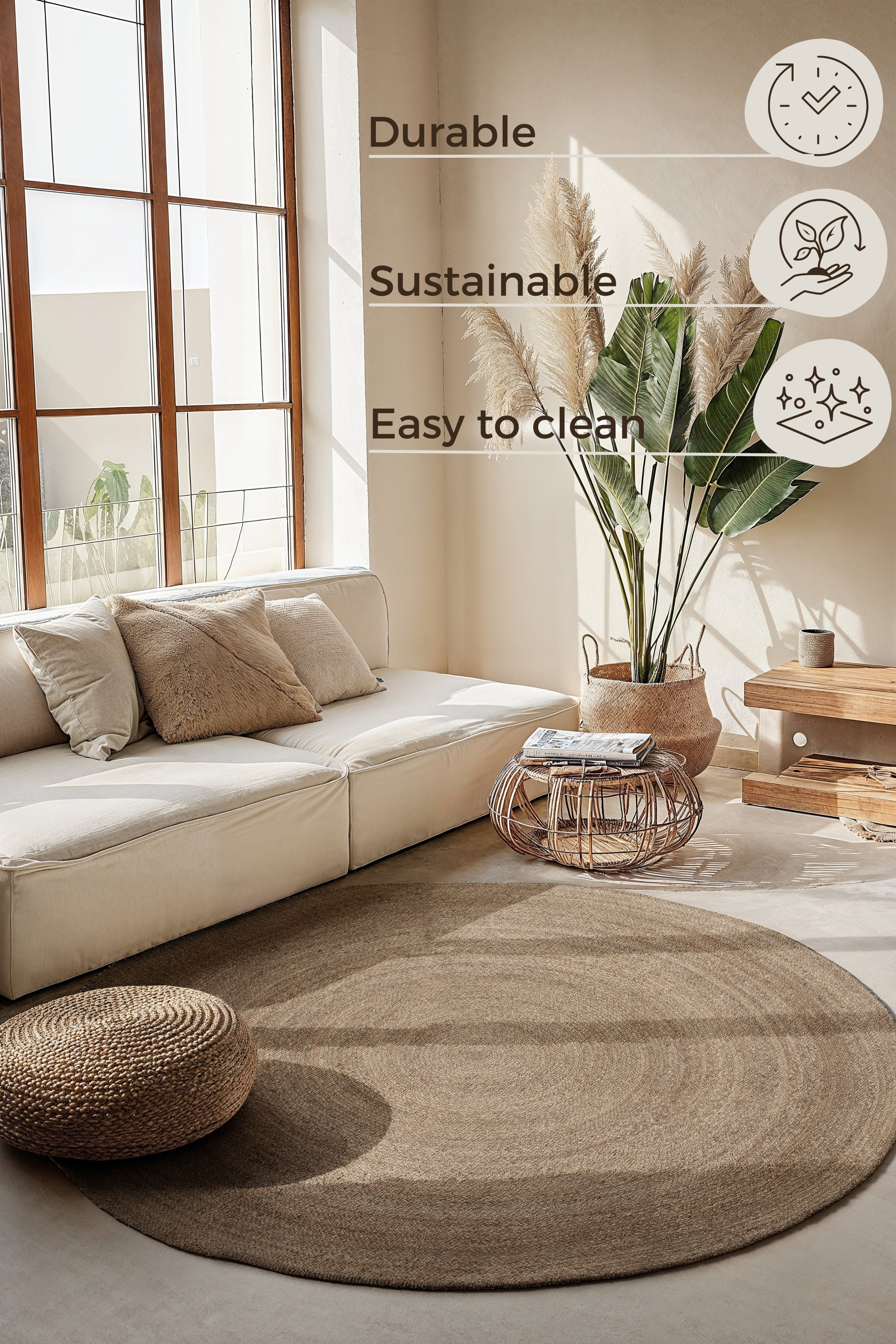 Jute Braided-tæppet er ikke kun smukt, men også utroligt praktisk. Det robuste og slidstærke jute-materiale, både på for- og bagside, sikrer lang holdbarhed og gør tæppet modstandsdygtigt over for dagligdagens slid. Tæppet er desuden velegnet til gulvvarme, så du kan nyde den behagelige varme, der fordeles jævnt under tæppet. Den naturlige jute er smudsafvisende og let at rengøre, hvilket gør det til et ideelt valg for travle hjem. Hvert tæppe er unikt i sin farvesammensætning på grund af de naturlige materialer, hvilket giver dit hjem et personligt præg. Bemærk venligst, at der kan forekomme mindre farveafvigelser fra billederne.