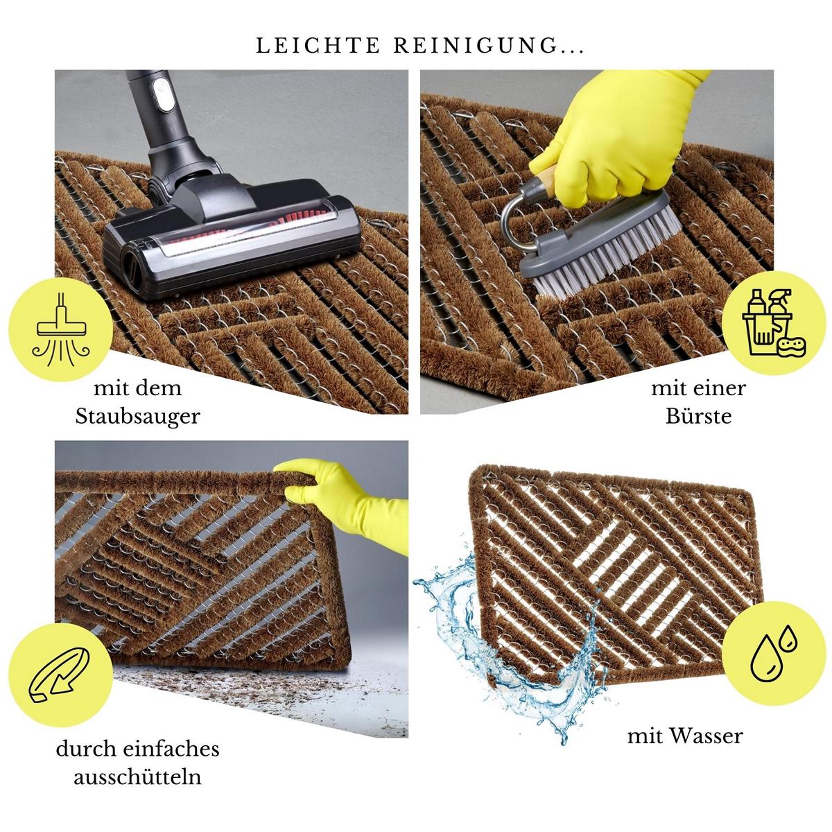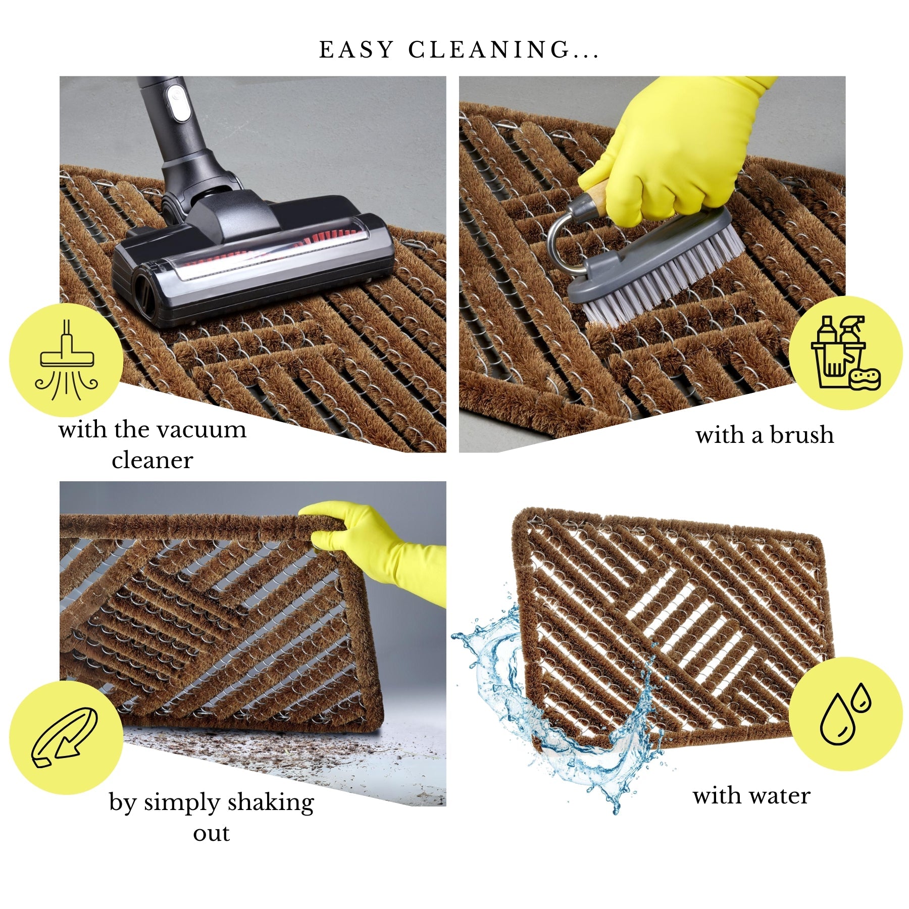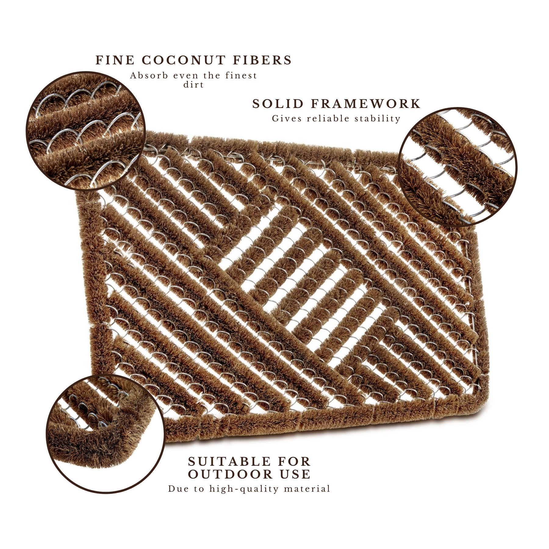 Kokosmåttens unikke sammensætning af 60% zink og 40% naturlige kokosfibre giver ikke blot et iøjnefaldende design, men tilbyder også en række praktiske fordele. De robuste kokosfibre fjerner effektivt snavs fra dine sko, mens den solide base af zink og kokos sikrer, at måtten ligger stabilt og ikke skrider. Kokosfibrene giver desuden et naturligt antibakterielt miljø, da de ikke tilbyder næring til bakterier. Snavs og bakterier forbliver dermed på måtten og transporteres ikke ind i din bolig.