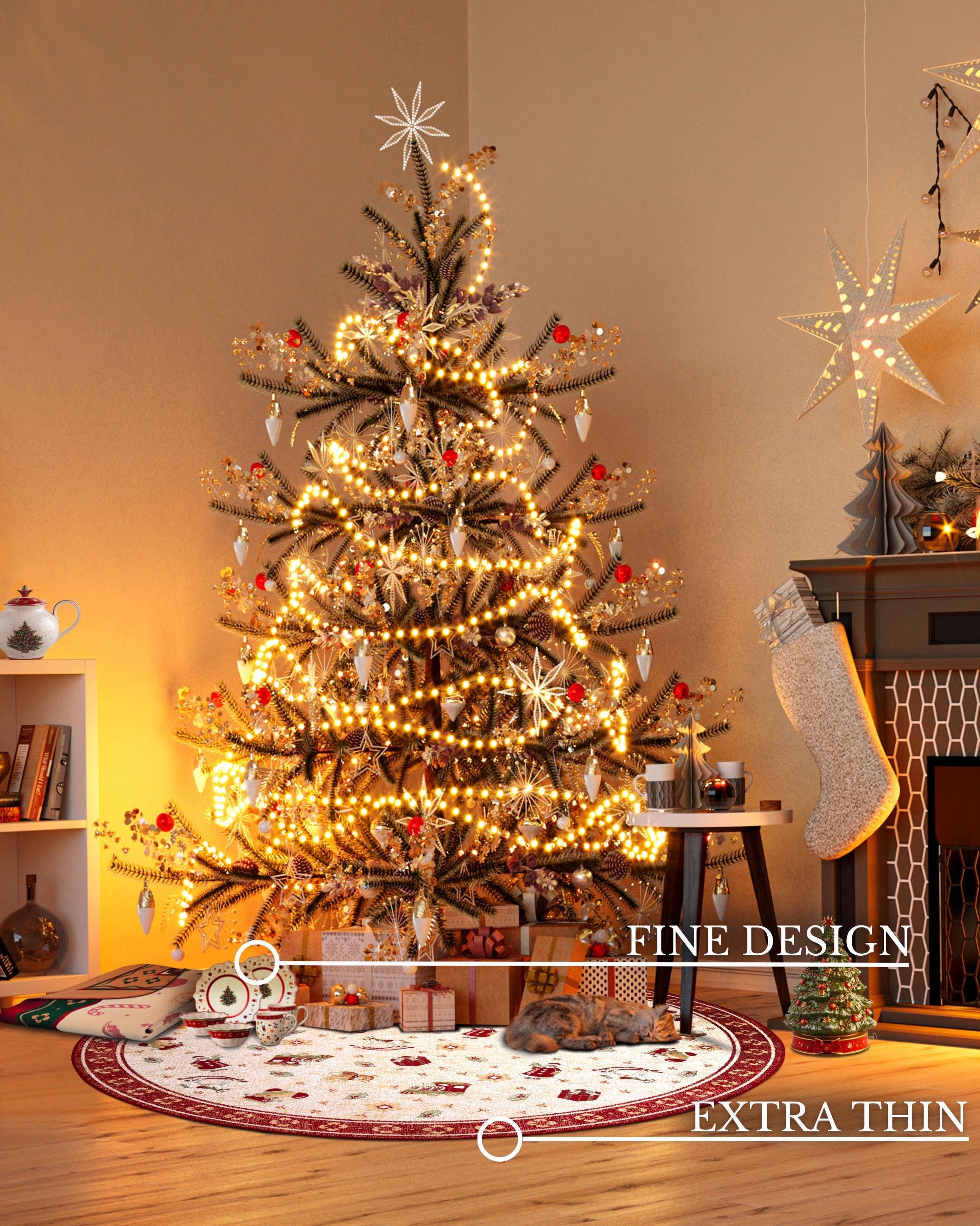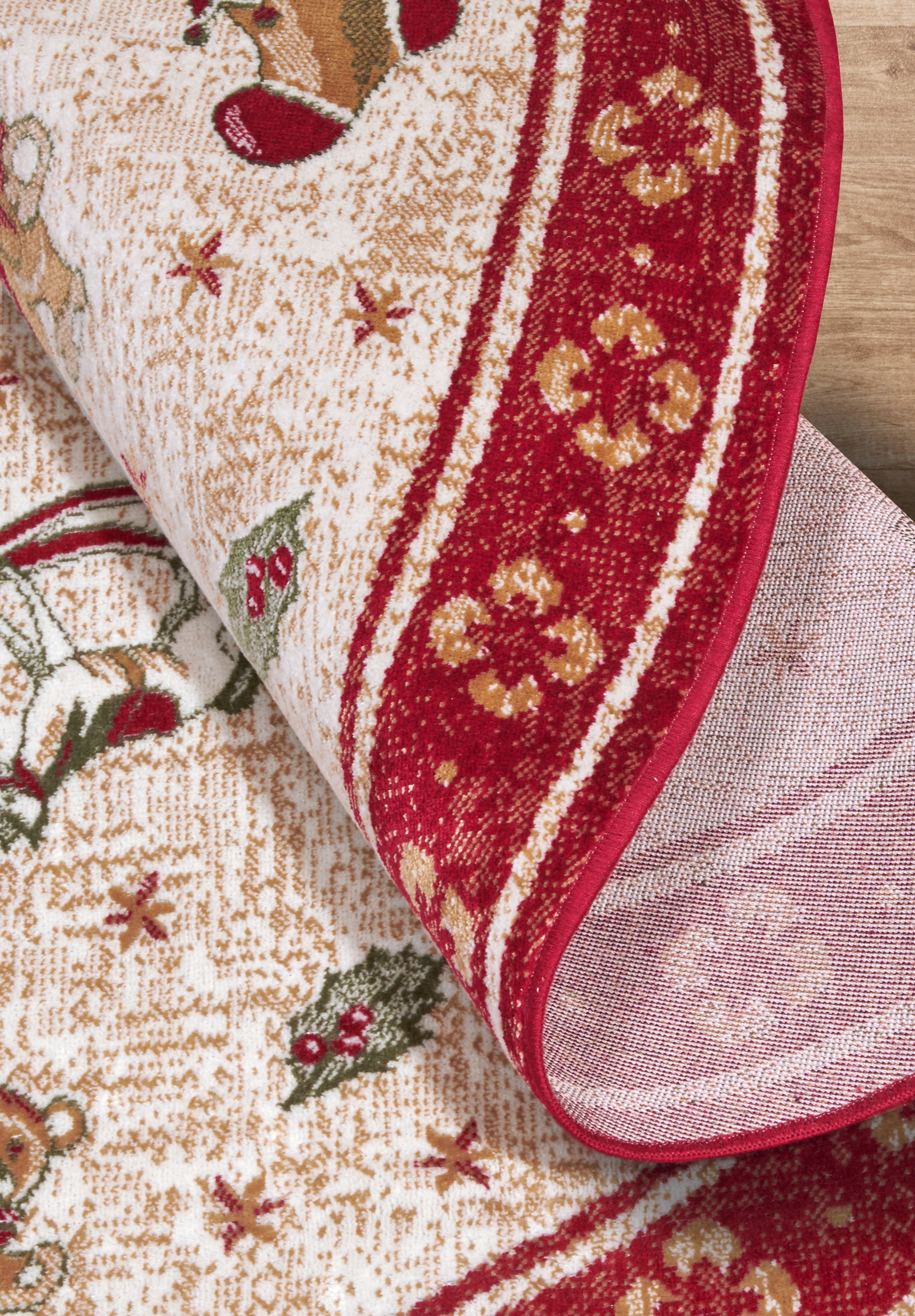 Tæppets legende Toy's Delight design vækker nostalgiske juleminder med sine fine detaljer. Den robuste kantning sikrer tæppets holdbarhed og fuldender det elegante udseende. Bagsiden, bestående af bomuld, latex og polyester, giver tæppet stabilitet og forhindrer det i at glide. Den bløde overflade er let at rengøre, hvilket er praktisk i en travl hverdag.