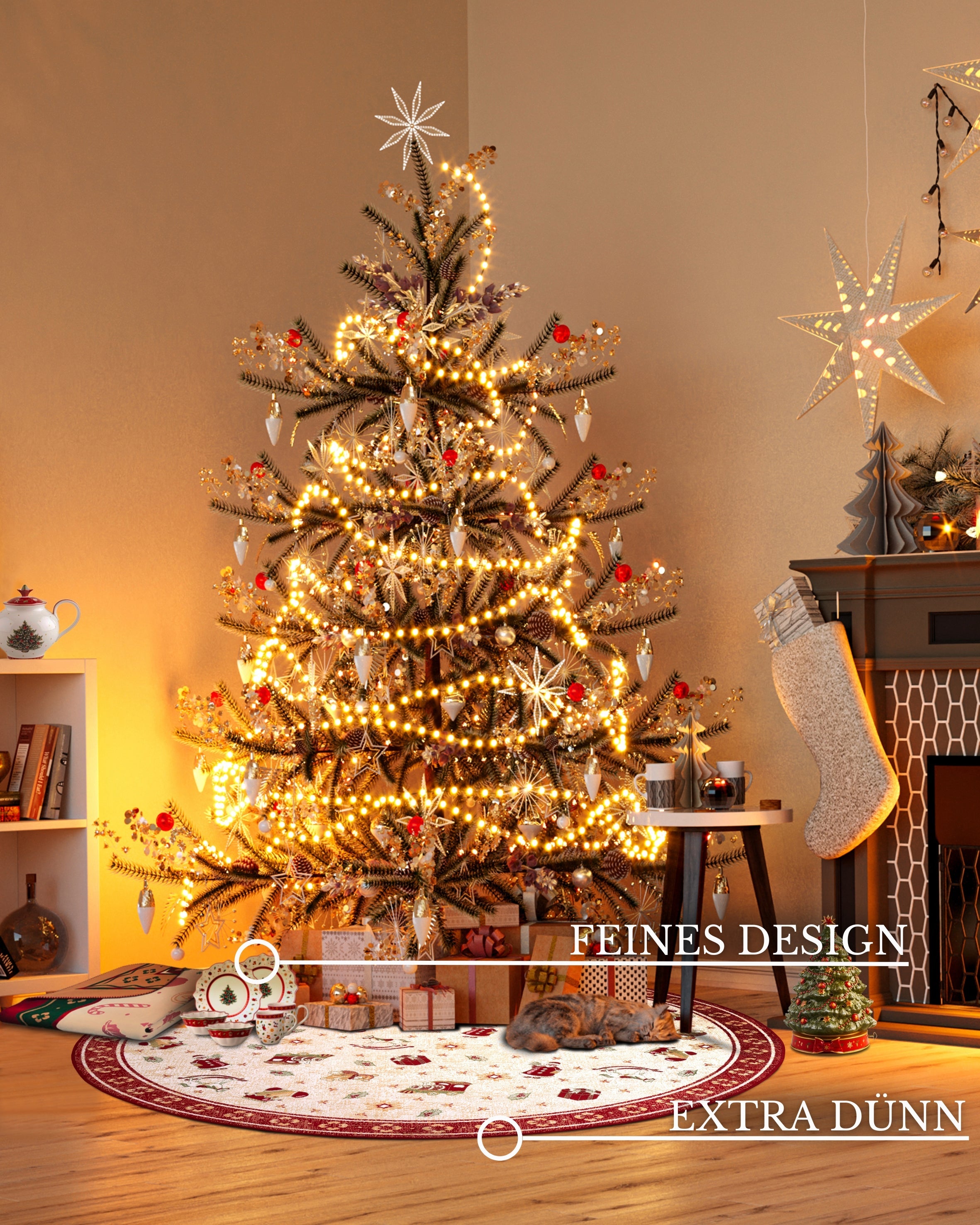 Skab en magisk julestemning på børneværelset med dette fortryllende runde tæppe fra Villeroy & Bochs Toy's Delight kollektion. Det bløde og slidstærke tæppe er fremstillet af en blanding af 50% bomuld og 50% viskose, der giver en behagelig følelse under fødderne og et festligt, skinnende udseende.