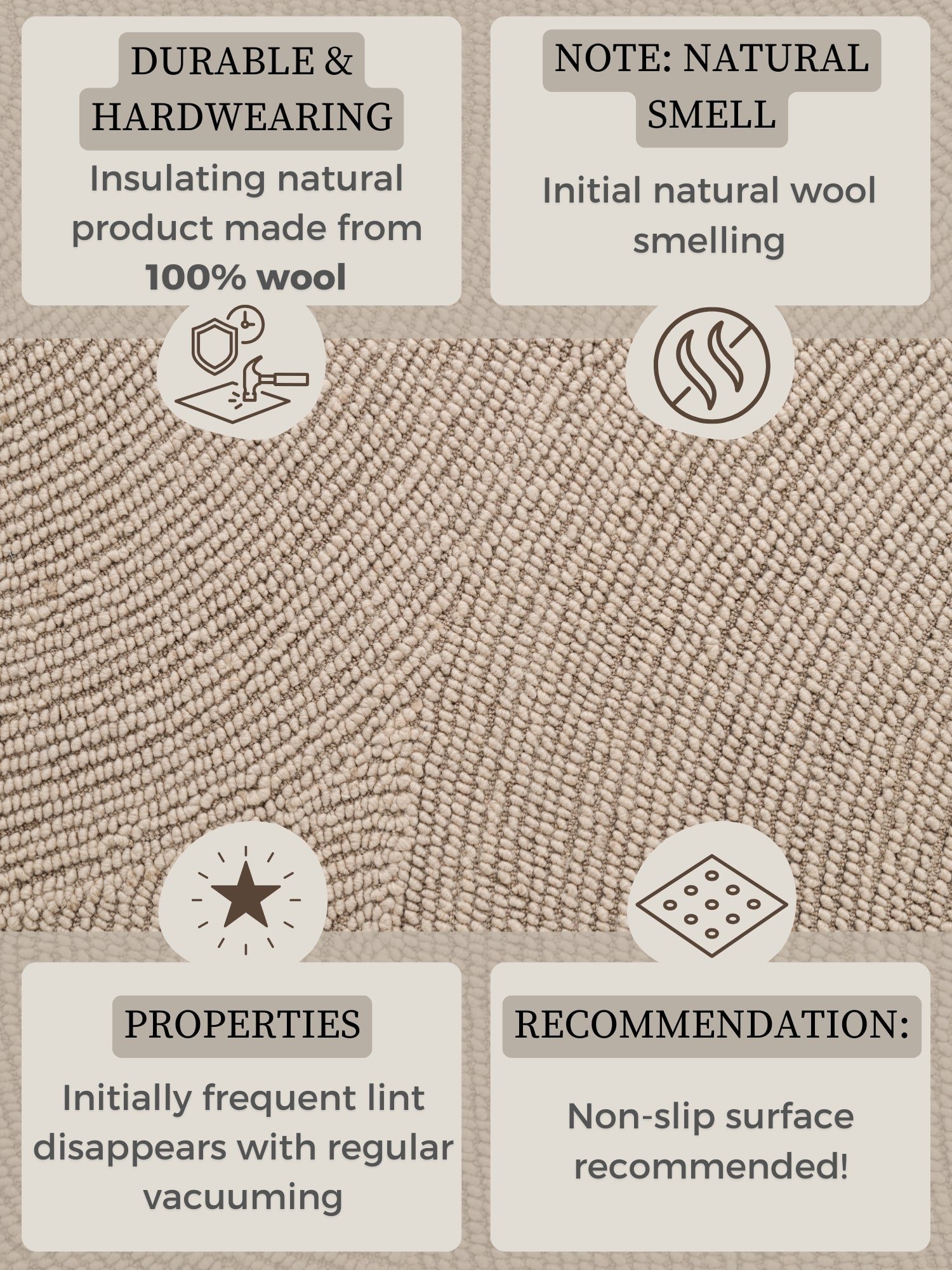 Forkæl dit hjem med den tidløse elegance fra Eleni-tæppet. Dette smukke, runde tæppe i beige er fremstillet af 100% uld, der giver en blød og naturlig fornemmelse under fødderne, samtidig med at det tilføjer en varm og indbydende atmosfære til ethvert rum.
