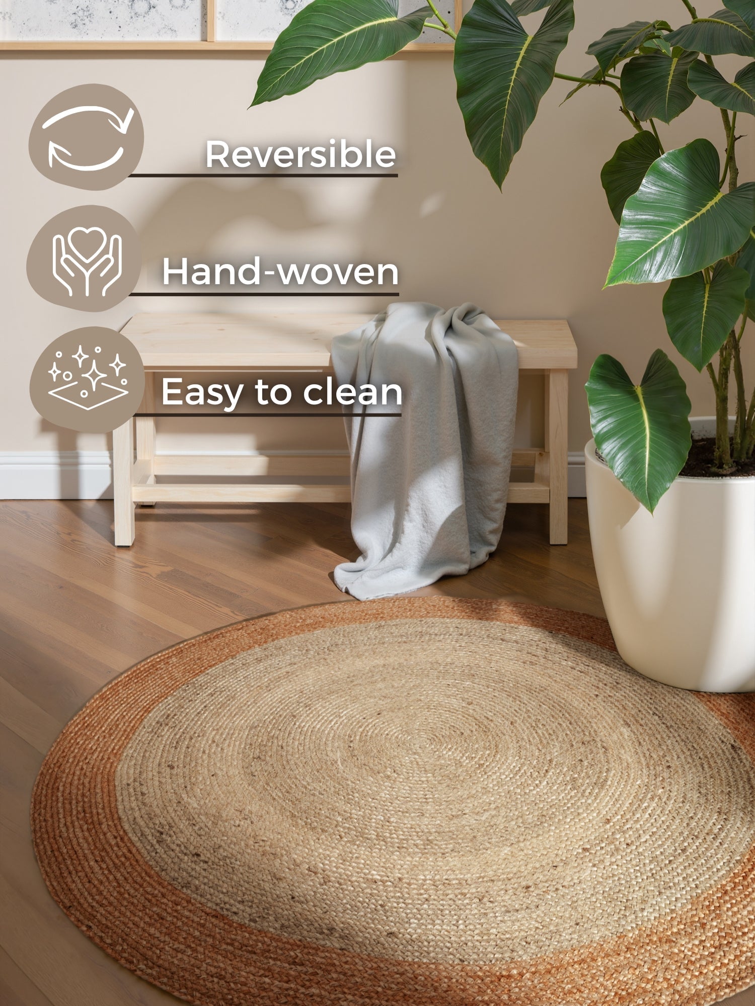 Inviter naturens rolige elegance ind i dit hjem med "Jutta" – et smukt, rundt tæppe i 100% jute fra Hanse Home. Med sin naturlige charme og tidløse udtryk skaber Jutta en varm og indbydende atmosfære i ethvert rum.