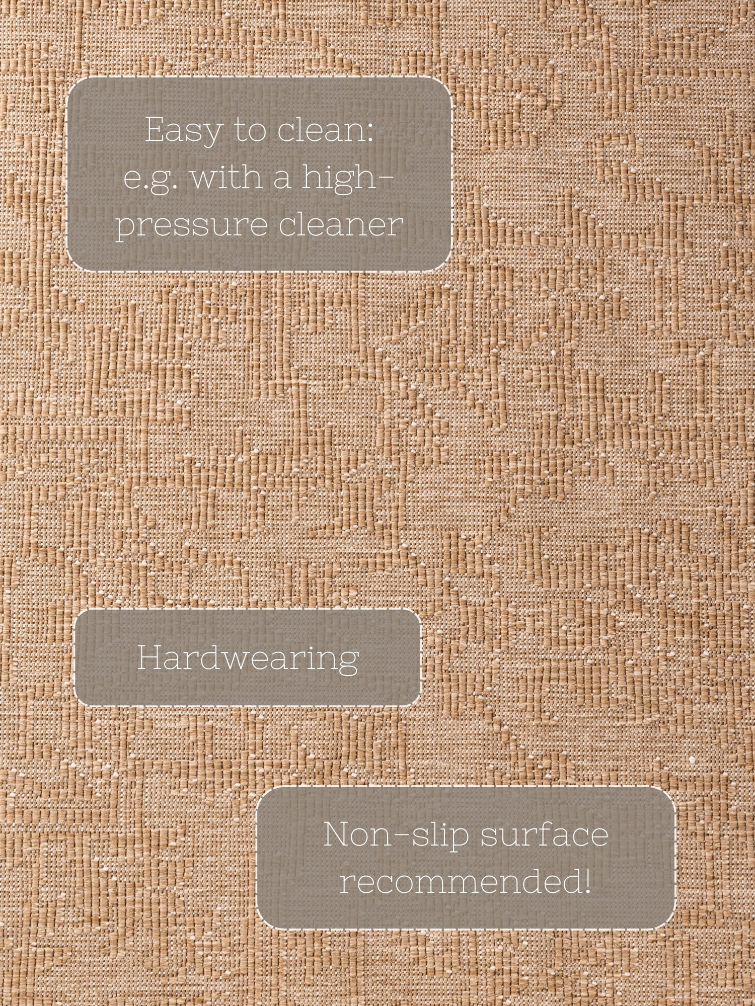 Duet tæppet er en sand multikunstner. Det vendbare design giver dig mulighed for at skifte look på et øjeblik og tilpasse det til din indretning. Den fladvævede konstruktion gør tæppet robust, smudsafvisende og vejrbestandigt, perfekt til både indendørs og udendørs brug. Tæppet er maskinfremstillet og egnet til gulvvarme, hvilket tilføjer ekstra komfort og funktionalitet. Den slidstærke polypropylen bagside sikrer stabilitet og forlænger tæppets levetid.