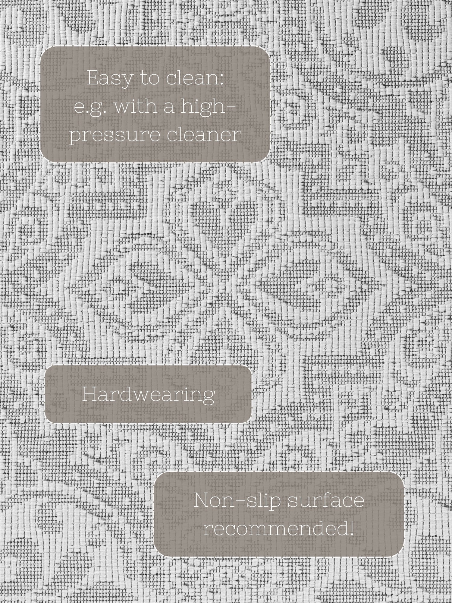 Duet tæppet er en sand multikunstner. Brug det som et blødt og behageligt tæppe i stuen, eller giv din terrasse eller altan et stilfuldt løft. Med sin vendbare design kan du nemt skifte look og farve efter humør og sæson. Det fladvævede, maskinfremstillede tæppe er robust, smudsafvisende og vejrbestandigt, og det er endda egnet til gulvvarme. Den slidstærke polypropylen bagside sikrer yderligere stabilitet og holdbarhed.