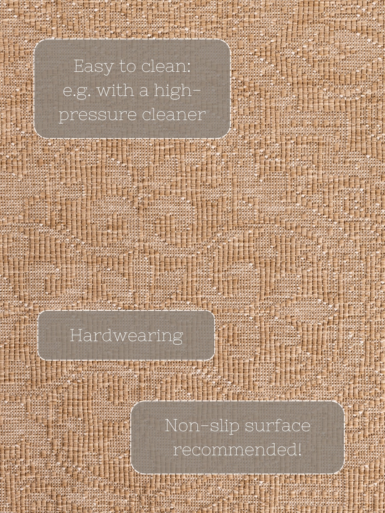 Duet tæppet er et sandt multitalent. Det kan bruges på begge sider, hvilket giver dig mulighed for at variere udtrykket efter behov. Den fladvævede konstruktion gør tæppet robust og nemt at vedligeholde, samtidig med at det er kompatibelt med gulvvarme. Det slidstærke polypropylen materiale på både for- og bagside gør tæppet modstandsdygtigt overfor snavs og vejr, så du kan nyde det i mange år. Den praktiske konstruktion sikrer en problemfri oplevelse, uanset hvor du vælger at placere det.