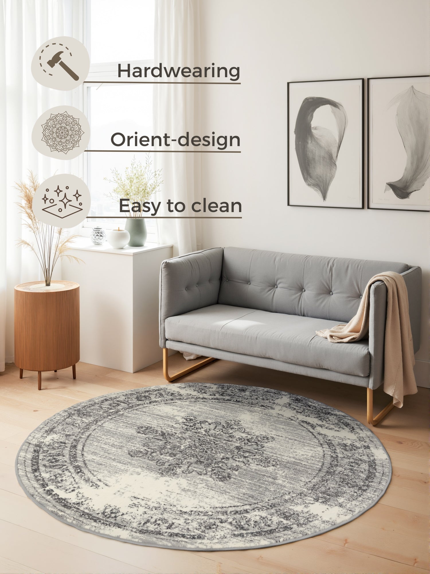 Tilføj et strejf af orientalsk elegance til dit hjem med Gloria-tæppet. Dette smukke, runde tæppe er fremstillet af 100% polypropylen, der giver en blød og behagelig overflade, samtidig med at det er utrolig slidstærkt og nemt at vedligeholde. Den grå farve giver en rolig og afbalanceret atmosfære, der passer perfekt ind i den moderne indretning.