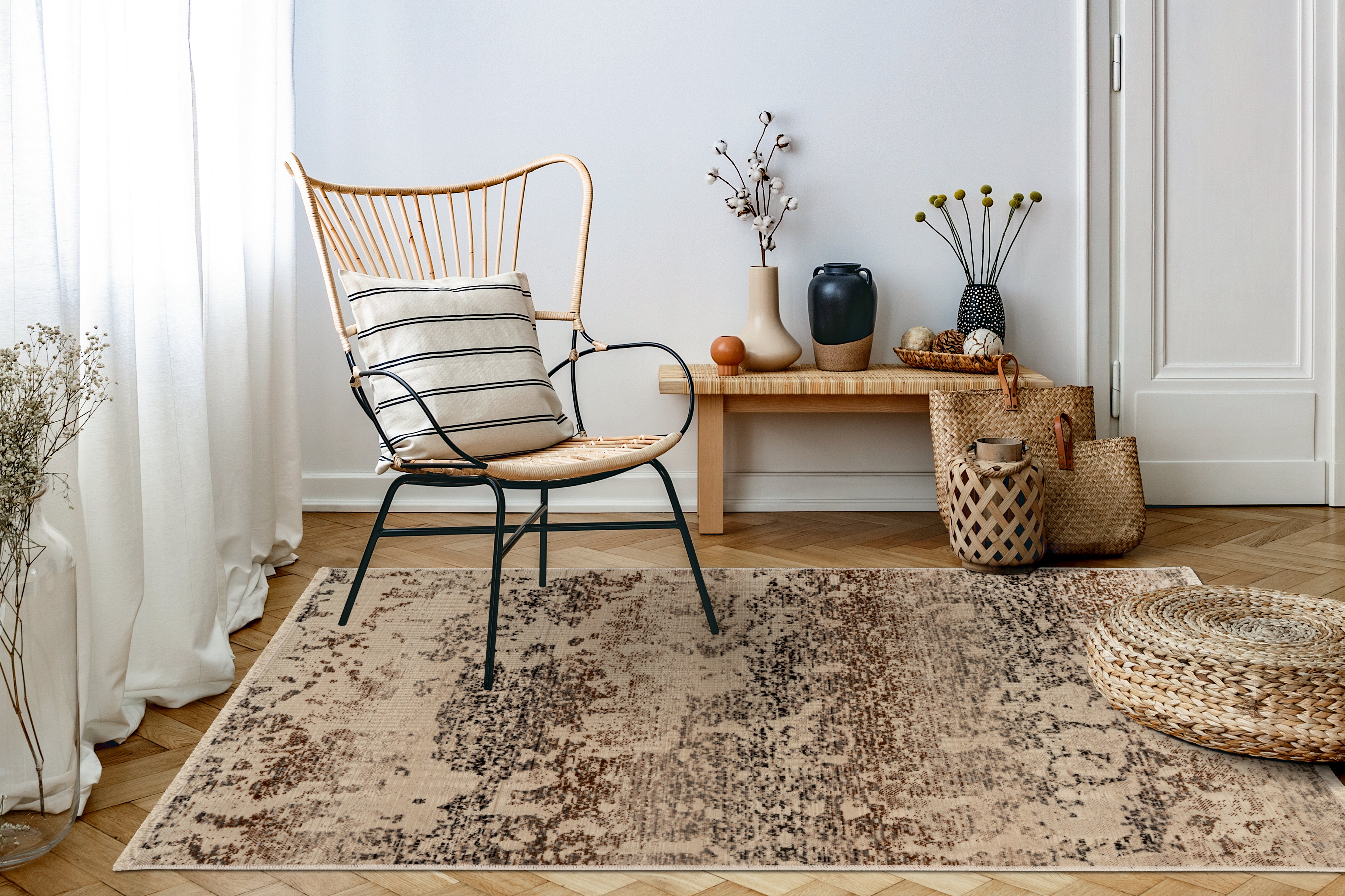 Dette stilfulde tæppe med et slidt look fås i en række forskellige farver. Det maskinvævede tæppe er lavet af 100% polypropylen og er skridsikkert. Den lave tykkelse på kun 3,5 mm gør det særligt robust og nemt at vedligeholde – et slidstærkt tæppe til enhver lejlighed!