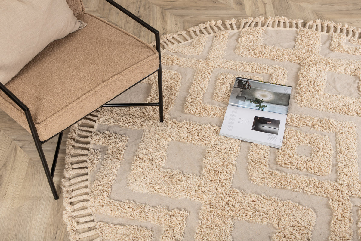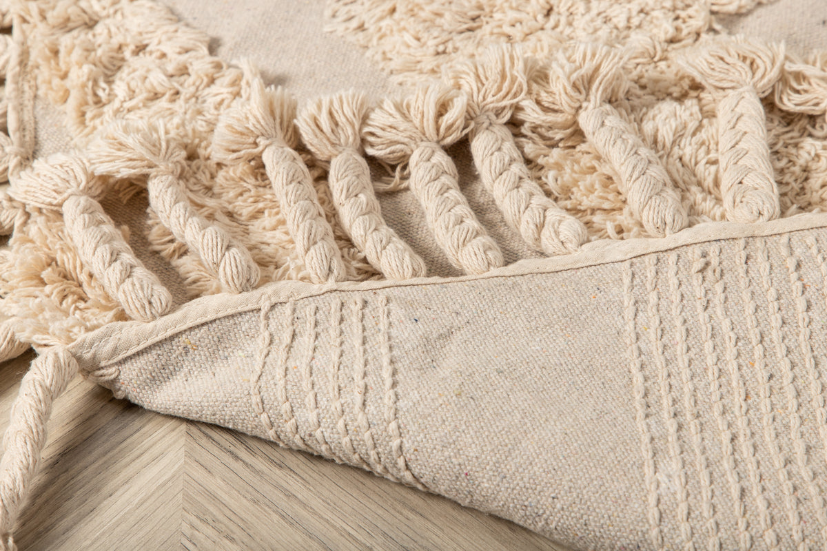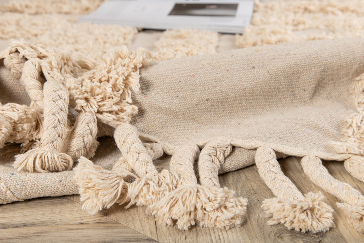 Smukt tæppe i et blødt bomulds materiale med frynser. Tæppet har et lineært dekorativt høj/lav mønster. Hilma er et klassisk tæppe, der passer ind i de fleste hjem. Tæppet fås i flere forskellige størrelser. Fx som rundt og som løber .