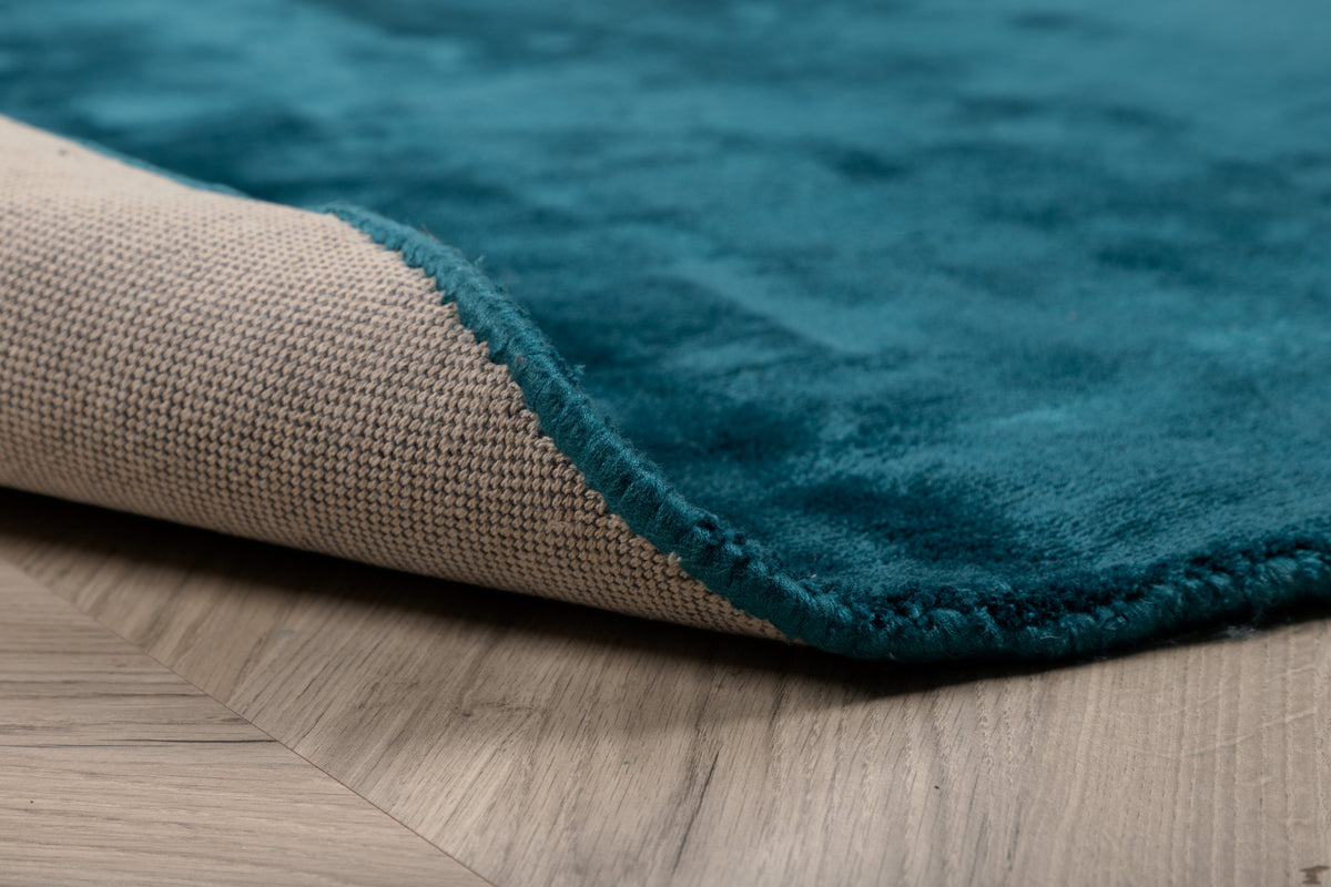 En turkis drøm i en trendy rund form og eksklusivt håndvævet materiale! Med tæppeserien Indra finder du flere forskellige viskosetæpper i forskellige farver og størrelser, lavet af viskose på toppen og bomuld nedenunder. Den lækre turkis farve skaber et behageligt blikfang og materialets glitrende egenskaber giver rummet en luksuriøs og silkeblød fornemmelse. Tæppets moderne runde form gør det nemt at placere og det passer lige så godt under sofabordet som i soveværelset - du bestemmer! Plejeråd: Regelmæssig og skånsom børstning og støvsugning er at foretrække for at mindske risikoen for, at støv og snavs sætter sig i fibrenes rødder. Viskosetæpper er kun egnet til indendørs brug, udsættelse for direkte sollys kan føre til misfarvning, så sørg for at vende tæppet regelmæssigt.