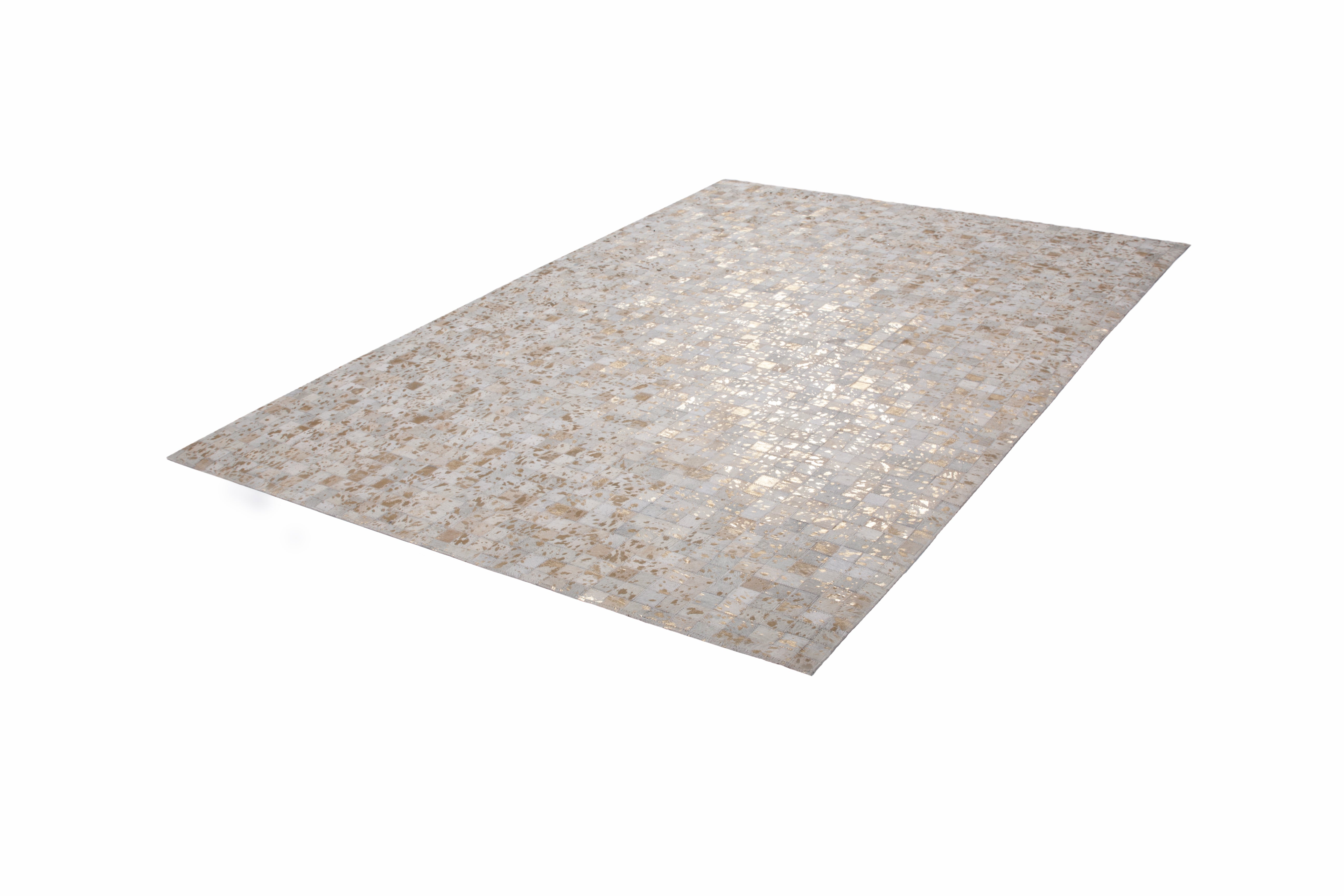 Metalapplikationer på ægte læder med bløde hår kendetegner dette tæppe. Tag dette unikke blikfang med hjem, og dine gæster vil blive forbløffede. Lædertæppet i patchwork-stil er baseret på forskellige nuancer af én farve. Den trykte metalliske folie er tæppets særlige højdepunkt, der tilføjer accenter og får tæppet til at skinne. Ingen to skind er identiske. Ligeledes er hvert af disse lædertæpper unikt på grund af naturlige variationer i størrelse, farve, mønster og tekstur. Disse unikke stykker suppleres af foliedekorationen i klare farver, guld eller sølv. Dette tæppe af høj kvalitet er kærligt håndlavet af det naturlige materiale læder. Dets holdbarhed og robusthed, sammen med dets lysægthed og nemme rengøring, må ikke undervurderes. Blød filt beklædte undersiden af lædertæppet, hvilket understøtter varme- og lydisolering. Selv rum med gulvvarme er ikke et problem for tæppet. Kombineret med attraktive læderhynder, placeret på din sofa eller dekorativt på stole, kan du skabe et slående helhedsindtryk. Den naturlige pels kan falde af med tiden og ved kraftig brug. Ligeledes kan folietrykket skalle af nogle steder. Dette skyldes produktets naturlige natur og er ikke en kvalitetsfejl eller fabrikationsfejl.