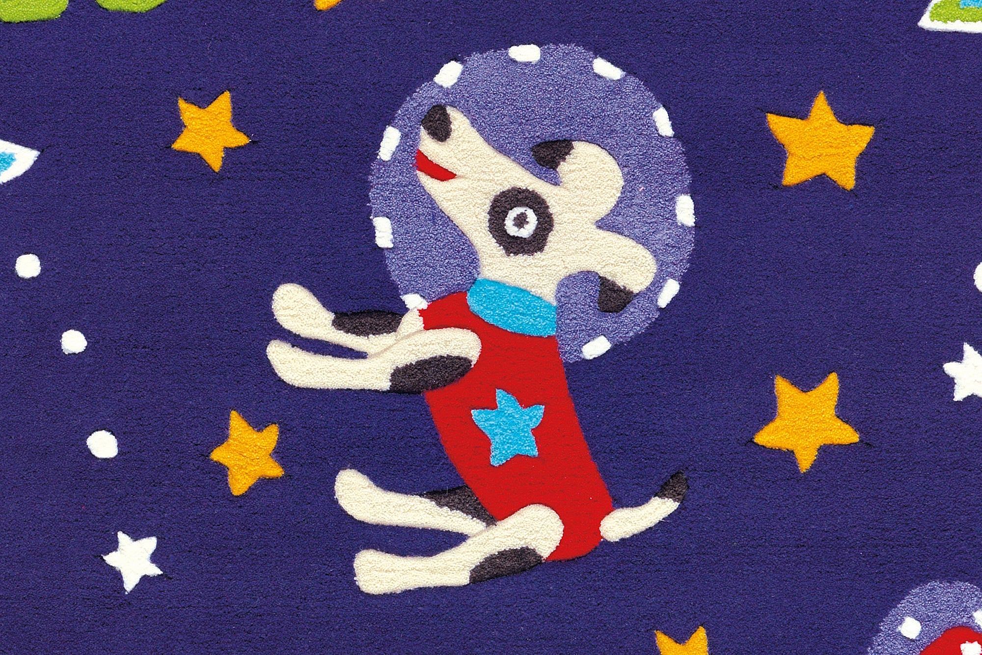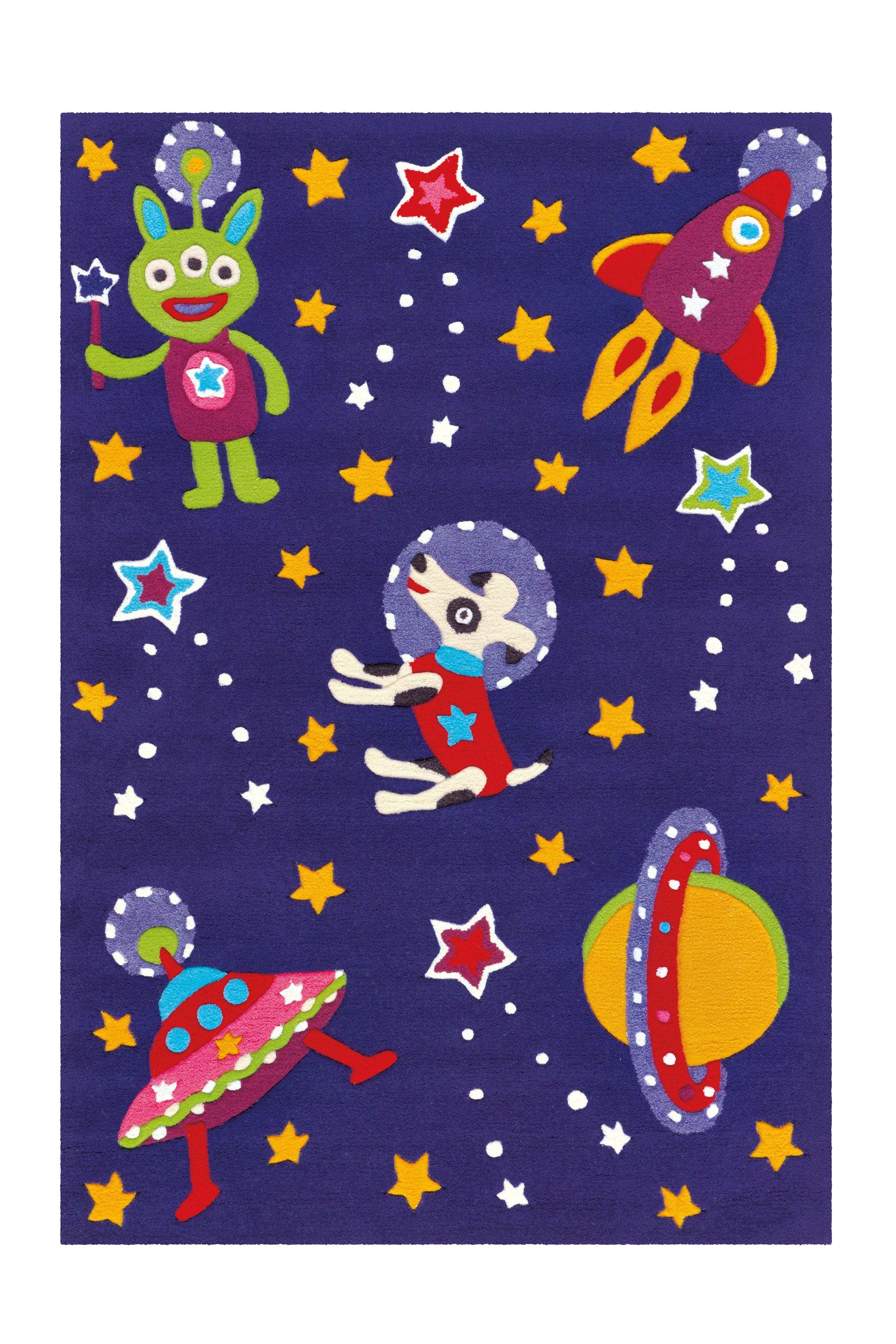 Dette kortluvede børnetæppe vil være et blikfang i ethvert børneværelse. Det farverige, børnevenlige design er et sandt blikfang i sig selv. Højdepunktet er de fluorescerende PES-garnelementer, der lyser i mørket. Det betyder, at når lyset er slukket, er børneværelset ikke med det samme helt mørkt, da det kortluvede tæppe udsender en blød og behagelig glød. Lys dine børns øjne op og placer et selvlysende tæppe i deres værelse. Den bløde akrylluv er ideel som legemåtte, da den ikke kun har et børnevenligt design, men også er ekstremt nem at pleje takket være materialet. Akrylmaterialet er forstærket af en polyester- og bomuldsbagside. Tæppet kan også nemt placeres i rum med gulvvarme.